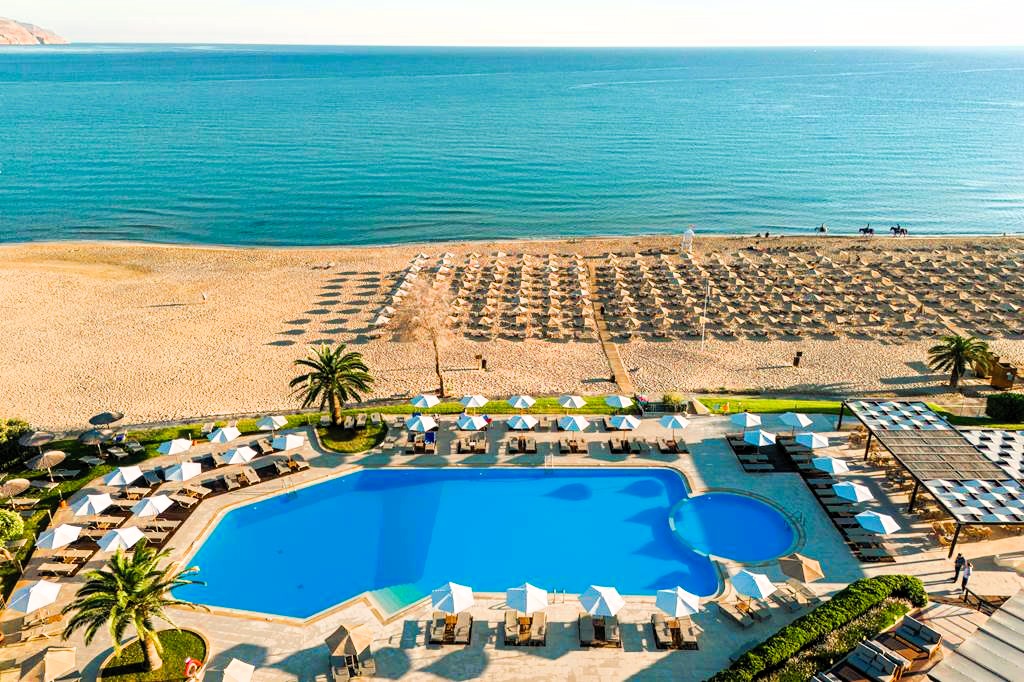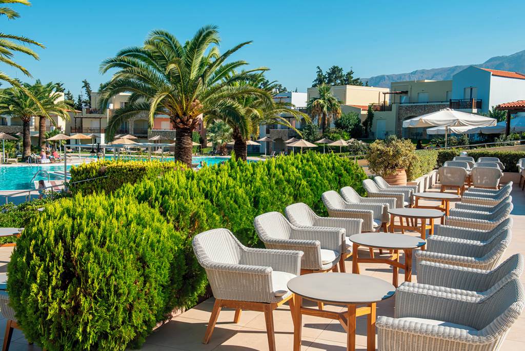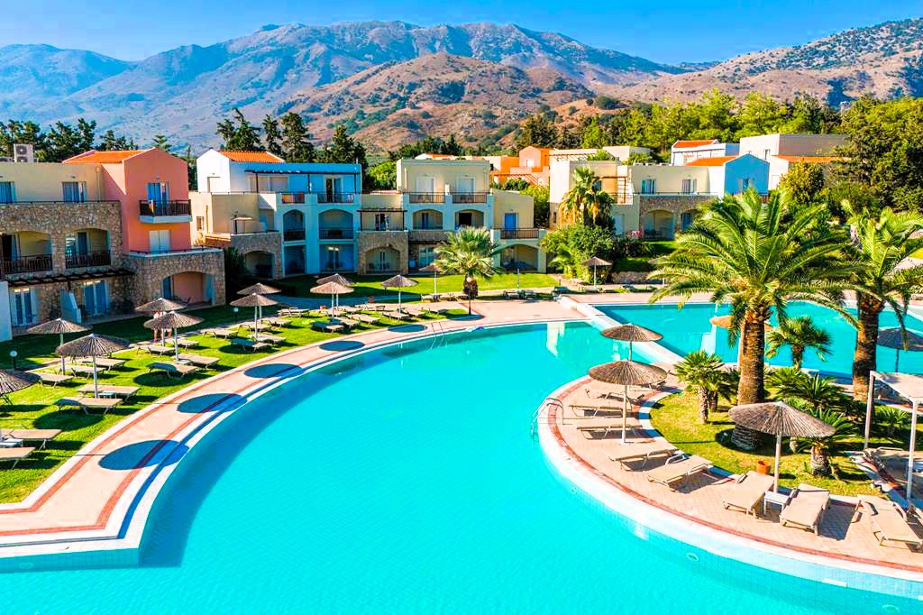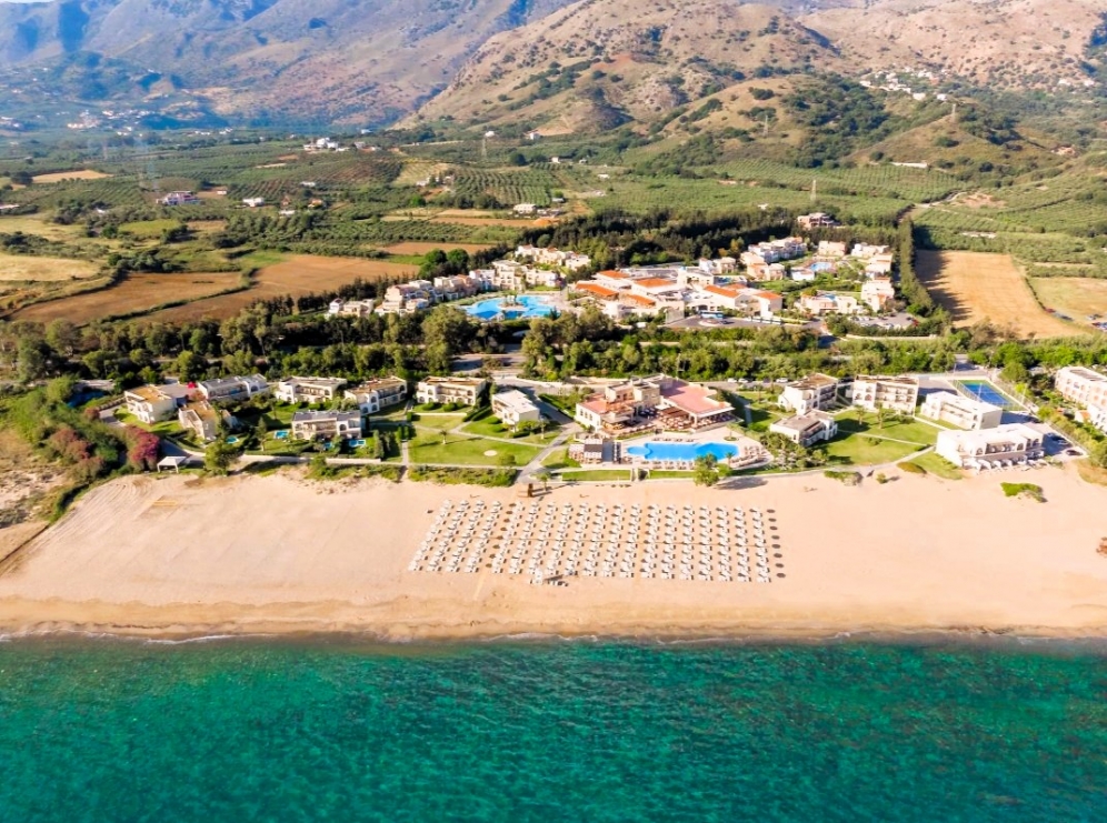 Pilot Beach Resort is located on the northwest shoreline of Crete, Greece, in the bay of Almyros neighboring the picturesque fishing village of Georgioupolis, halfway between Chania and Rethymno amongst a scenery of unparalleled beauty, and near settlements that retain the traditional Cretan elements but also villages with a cosmopolitan atmosphere. It offers a unique combination of tradition, hospitality and luxury with the comforts of a state of the art hotel. Pilot Beach Resort with its spacious stylish public areas and unique Cretan architecture is surrounded by olive and avocado trees and is directly on the sandy beach of Georgioupolis offering spectacular views of the Aegean Sea and of the famous White Mountains. Whilst it is considered among the finest five star hotels in Crete and offers services of the highest standards combined with the well known authentic Cretan Hospitality. |The architectural style of the resort emanates the atmosphere of a Cretan village. The resort offers 450 bungalows and suites of various types.|The resort's private sandy beach on the shores of the beautiful Aegean Sea, covers 400 meters and represents only a small stretch of the famed, 7 km long Georgioupolis Beach which is also awarded with the Blue Flag for maintaining the high standards of the international Blue Flag Organization regarding safety, quality of waters and the general infrastructure of the beach.|Pilot Beach Resort offers the ideal setting for a family vacation, with family accommodation and facilities, activities and supervised children activities. The beach is ideal for family holidays, where every family member can enjoy organized beach games and the shallow water at the shore is a children's paradise.