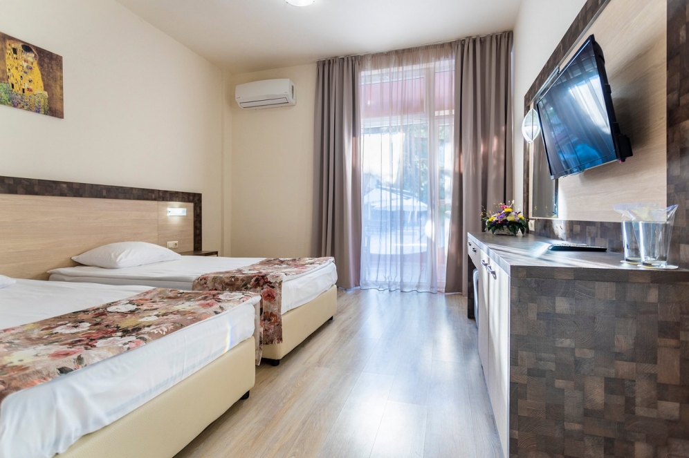 Kort beskrivning: Modernt och ljust rum med dubbelsäng eller två enkelsängar. Balkong med utsikt mot trädgård, pool eller stad. Luftkonditionering, platt-TV, minibar (daglig påfyllning med läsk och öl), vattenkokare, kassafack, Wi-Fi. Badrum med dusch, hårtork och toalettartiklar. Möjlighet till en extrabädd. Städning 7 ggr/vecka.