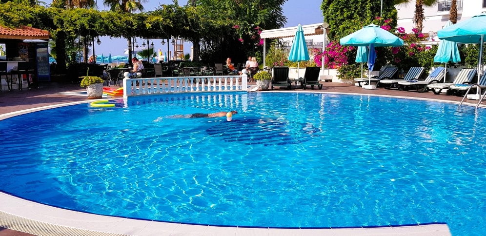 Azak Hotel har en mindre utomhuspool med solstolar och parasoller, samt en separat barnsektion. Hotellet ligger direkt på Kleopatrastranden, vilket gör det enkelt att växla mellan pool och hav. Stranden erbjuder vattensporter, strandserveringar och långsträckta promenadstråk längs kusten.