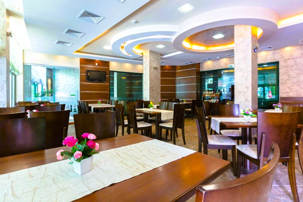 Frukostbuffé ingår i vistelsen. Hotellet har en restaurang som serverar både bulgariska och internationella rätter à la carte. Det finns även en bar med drycker och enklare snacks under dagen. Halvpension kan bokas som tillval.