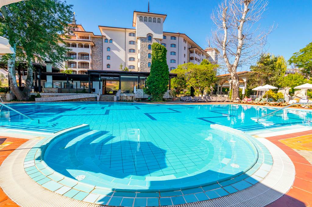 Hotellet har en stor utomhuspool med separat barnsektion, omgiven av solstolar, parasoller och välskötta trädgårdsytor. Poolområdet är lugnt och passar både för avkoppling och familjelek. Poolbaren erbjuder drycker och snacks under dagen.