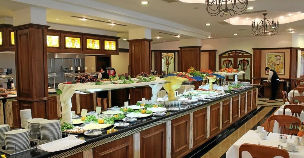 Royal Palace Helena Park erbjuder ett omfattande Ultra All Inclusive-program som gäller från morgon till sen kväll. Gästerna får tillgång till måltider, snacks, dryck och service i flera zoner – inklusive bufférestaurang, à la carte, barer och poolområden.