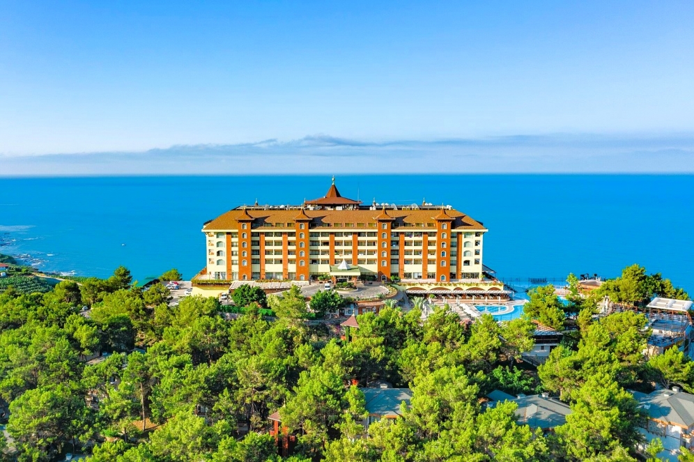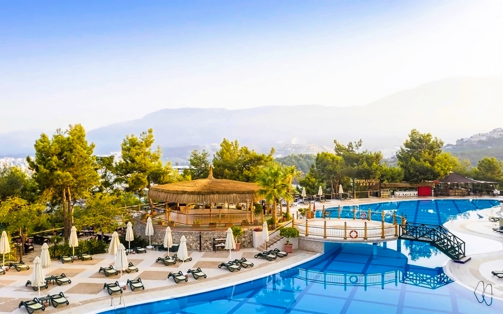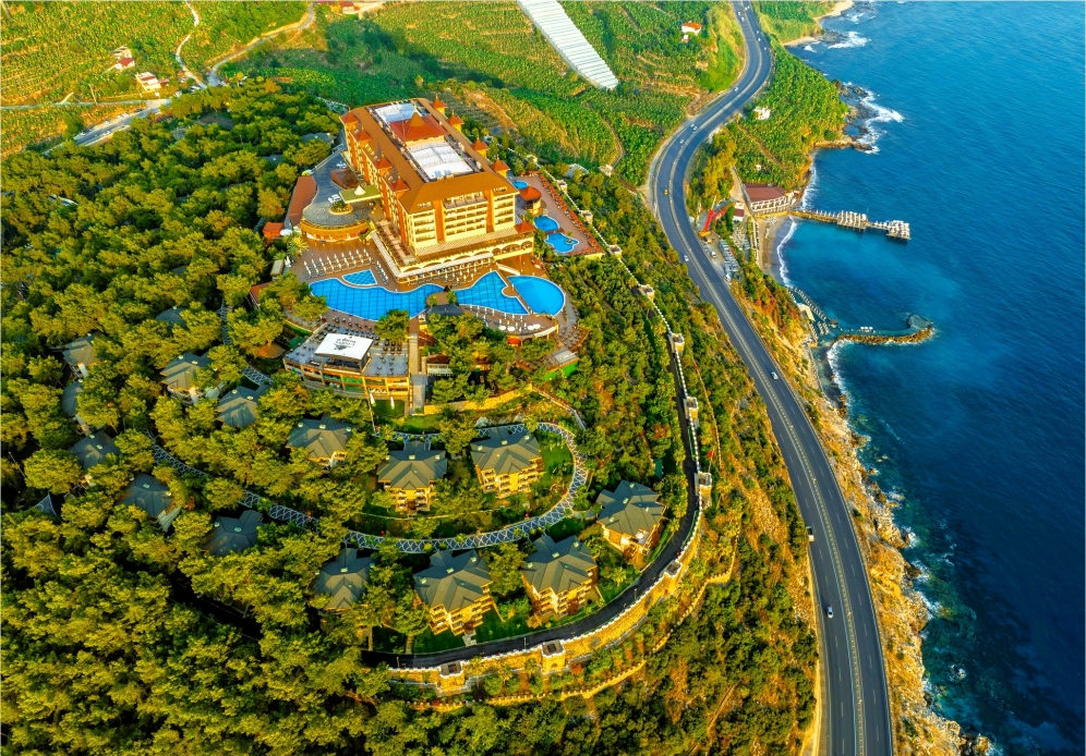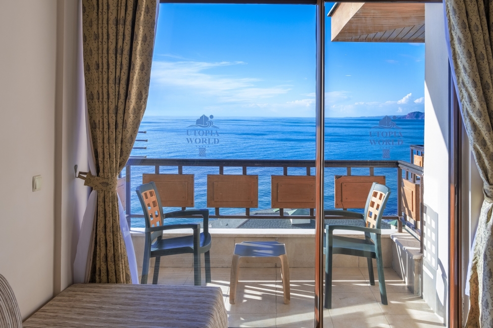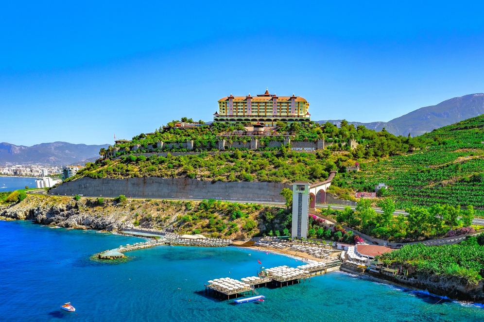 Utopia World Hotel är ett exklusivt och 5-stjärnigt resorthotell i absolut världsklass. Hotellet är beläget på en klippa ovanför Medelhavet med panoramautsikt över havet. Hotellet är omgivet av pinjeskog och har en egen strand, flera pooler, ett stort vattenland och ett brett utbud av aktiviteter för både vuxna och barn. Boendet sker i huvudbyggnad eller villor, och alla rum är utrustade med luftkonditionering, satellit-TV, minibar, kassafack, balkong eller terrass samt badrum med dusch eller badkar och hårtork.