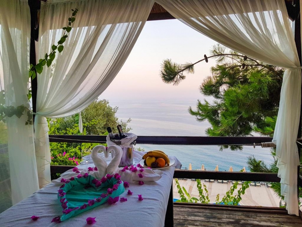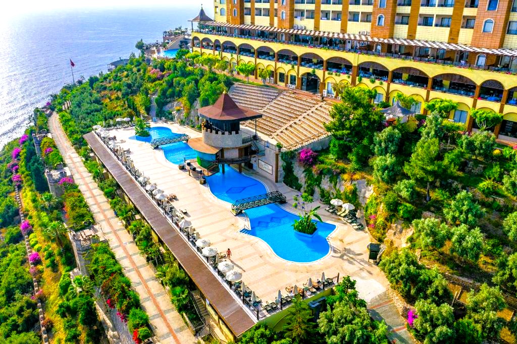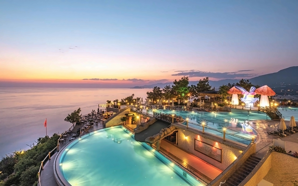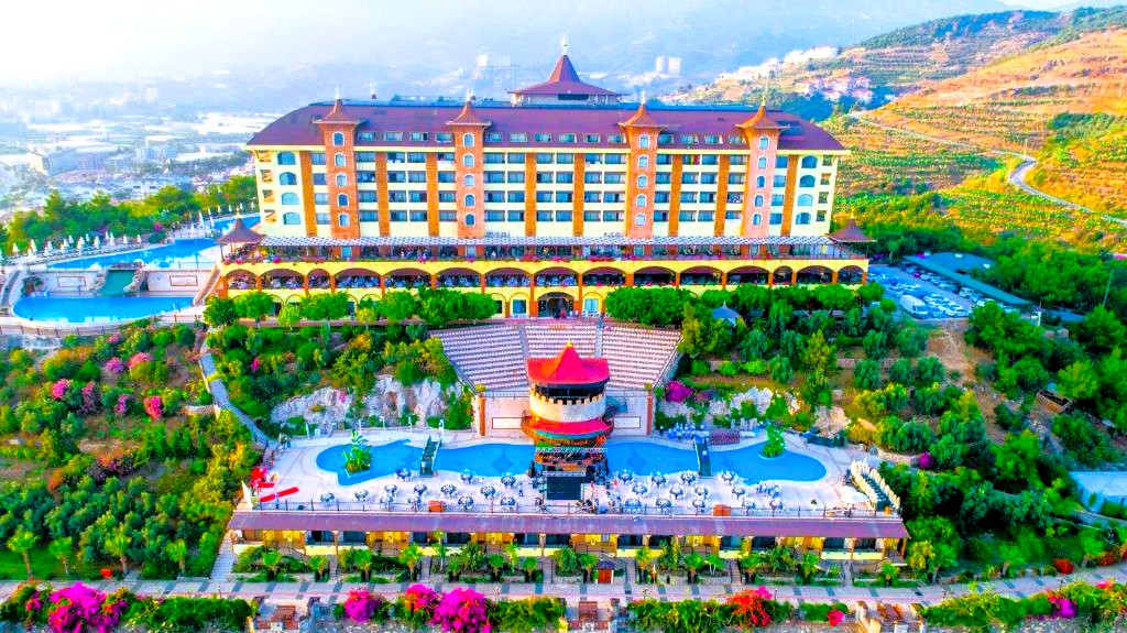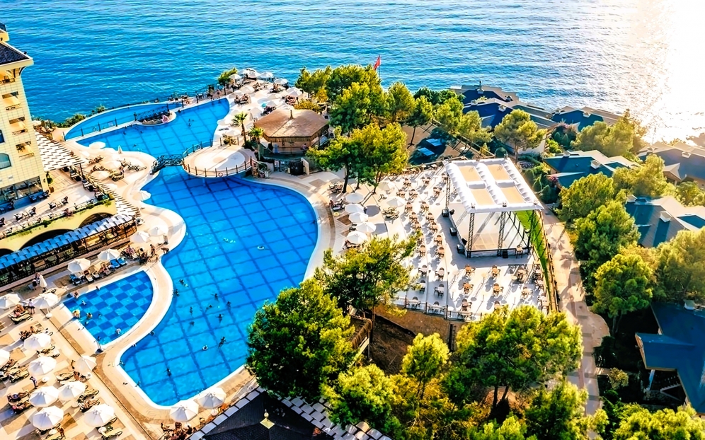 Utopia World Hotel är ett exklusivt och 5-stjärnigt resorthotell i absolut världsklass. Hotellet är beläget på en klippa ovanför Medelhavet med panoramautsikt över havet. Hotellet är omgivet av pinjeskog och har en egen strand, flera pooler, ett stort vattenland och ett brett utbud av aktiviteter för både vuxna och barn. Boendet sker i huvudbyggnad eller villor, och alla rum är utrustade med luftkonditionering, satellit-TV, minibar, kassafack, balkong eller terrass samt badrum med dusch eller badkar och hårtork.