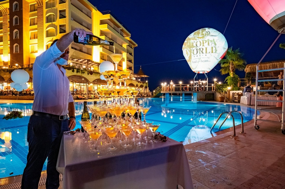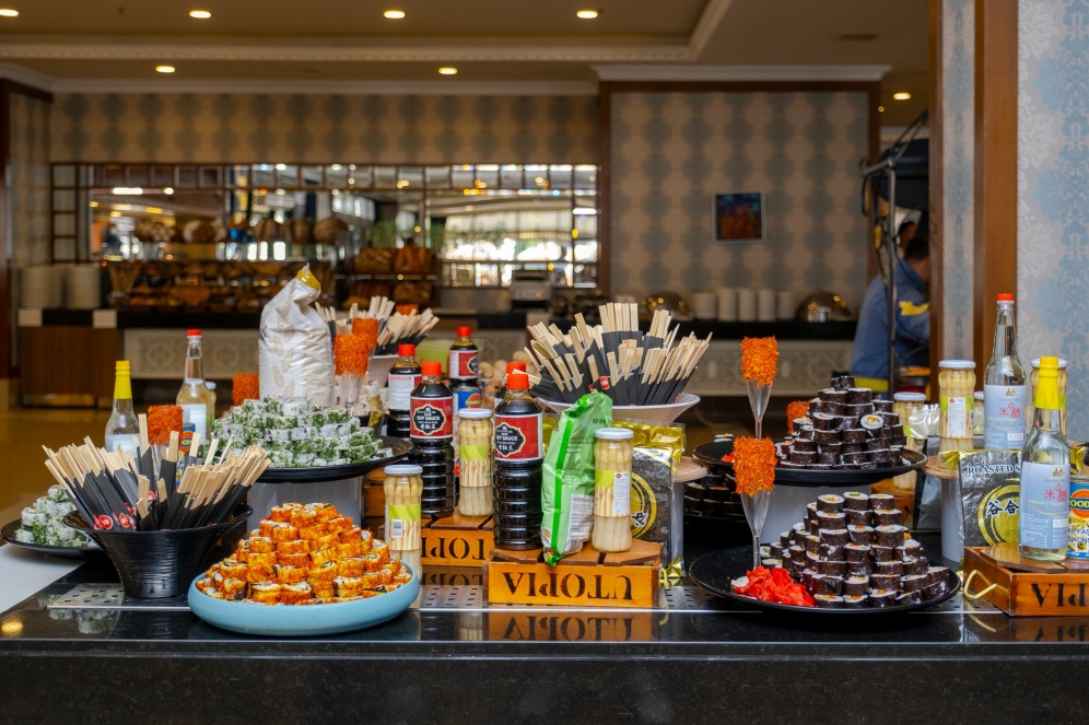 Utopia World Hotel erbjuder ett omfattande Ultra All Inclusive-program som gäller dygnet runt. Du får tillgång till måltider, snacks, dryck och service under hela dagen och natten – både i huvudrestaurangen och via hotellets barer och matstationer.